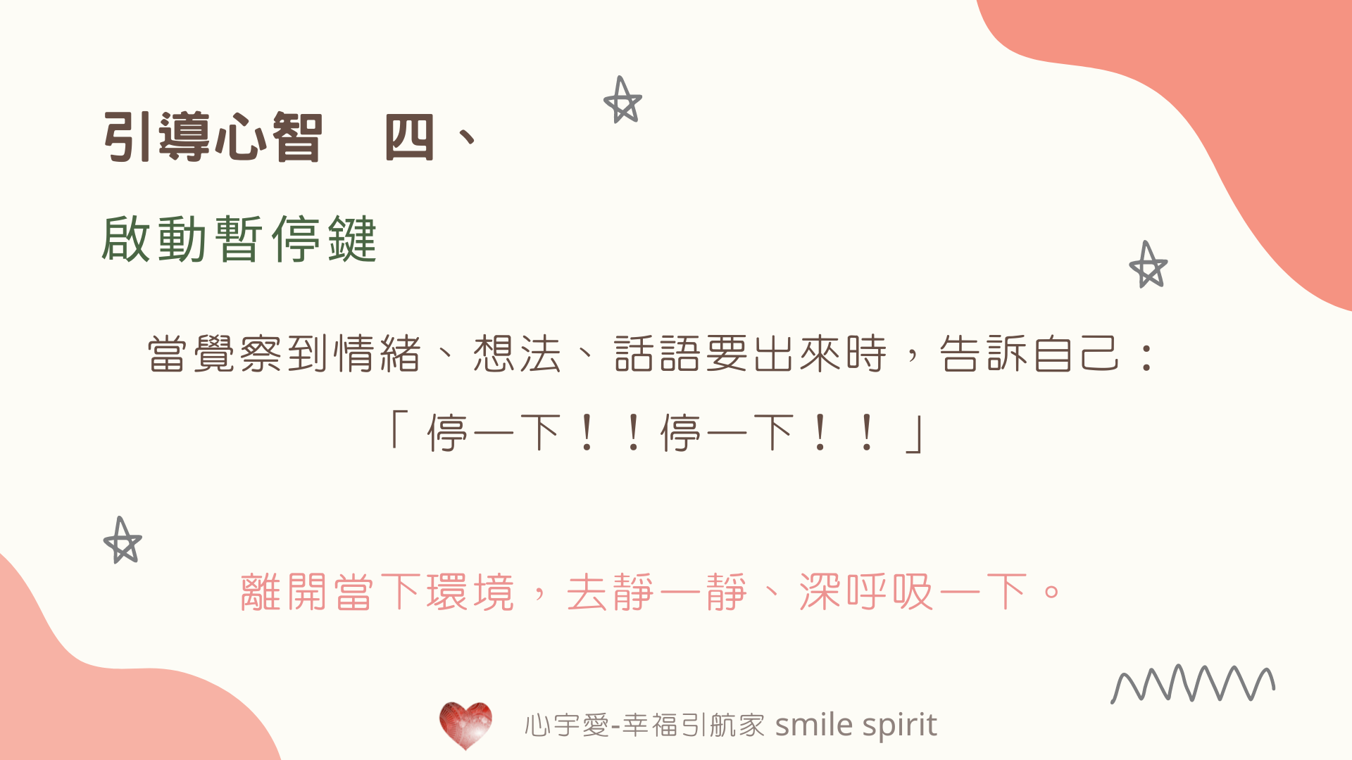 所以,當你覺察到情緒、想法、話語要出來時,告訴自己:停一下!!停一下!!