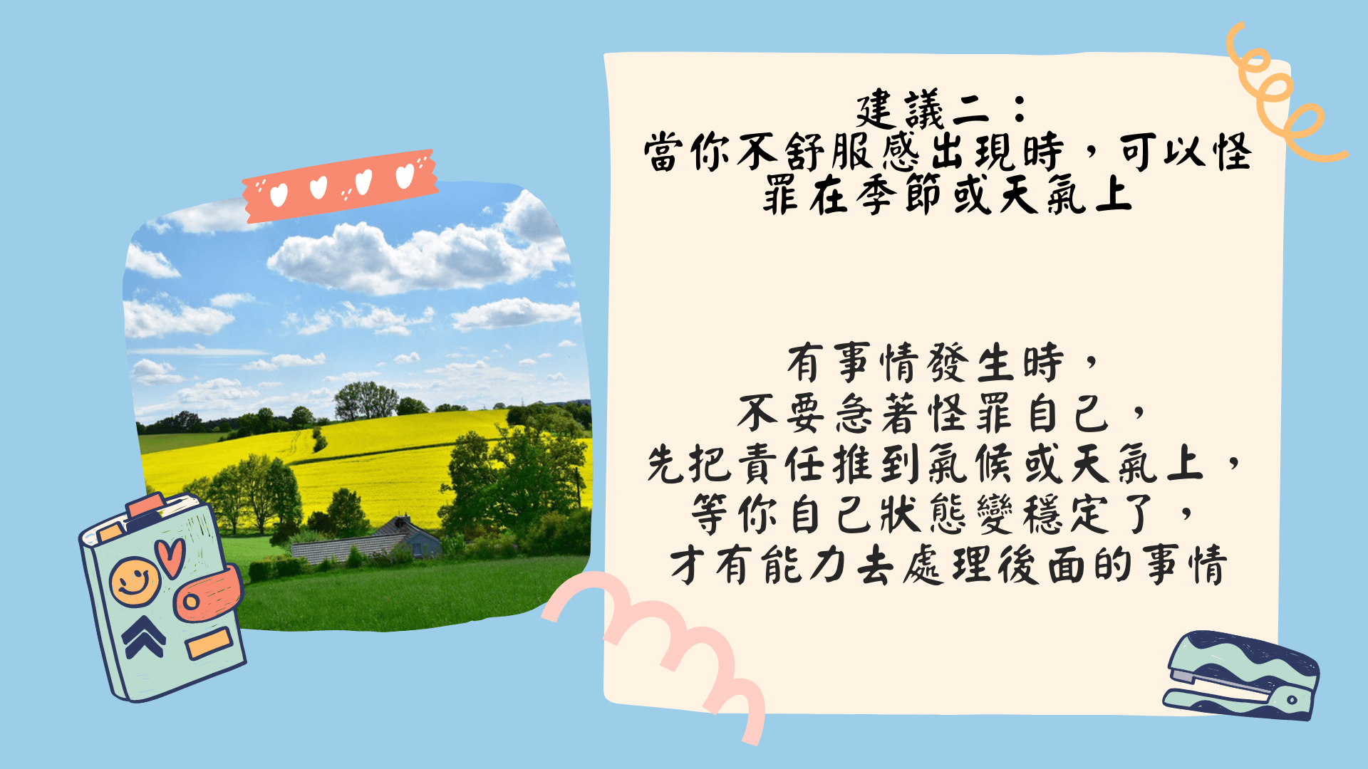 建議二:萬一你今天寂寞感或不舒服感出現時,你可以怪罪在季節或者天氣上面。這到底又在說什麽?