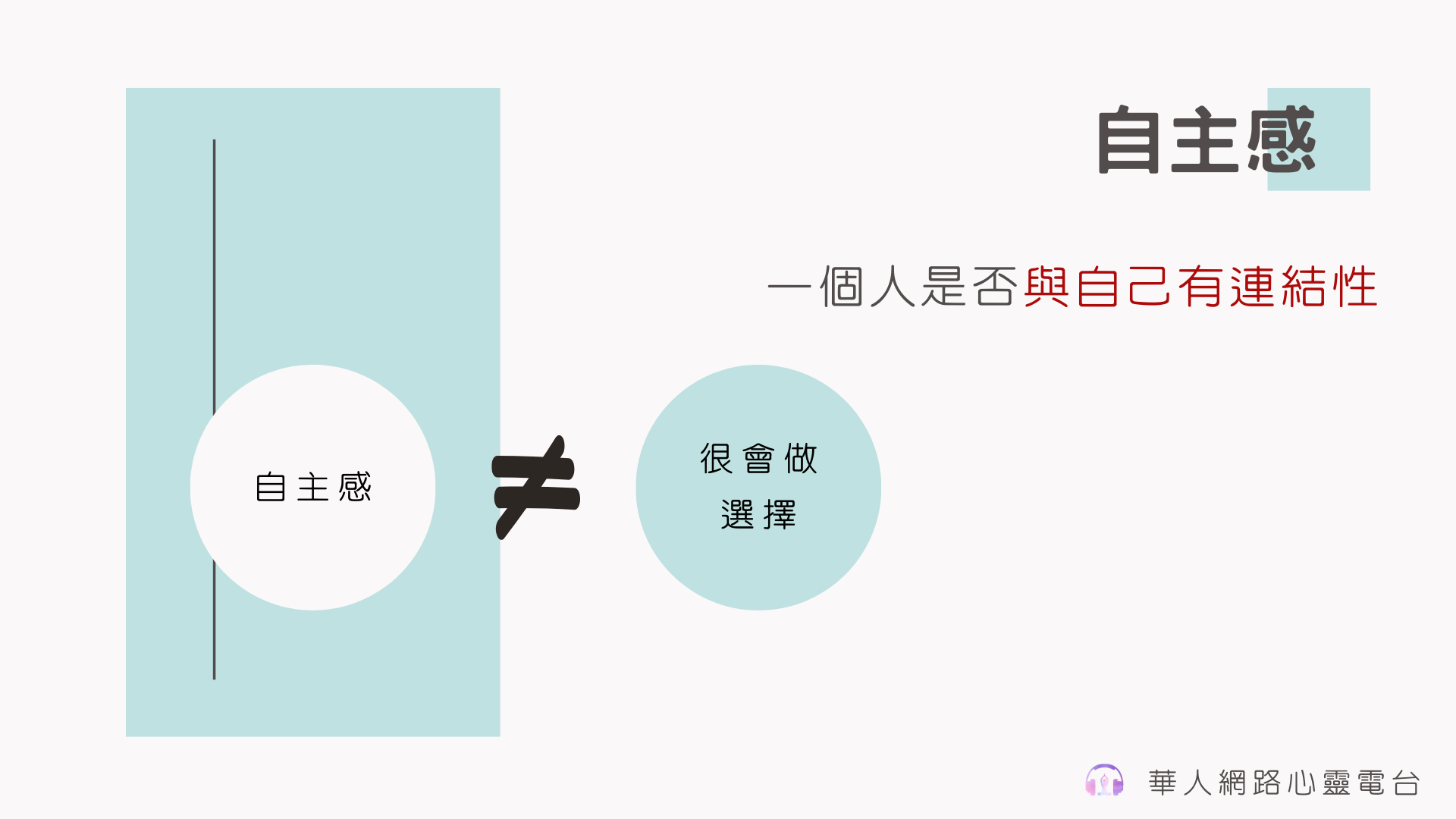 自主感,可能有人會覺得自主感好像是說,一個人很會做選擇,但是其實一個人很會做選擇不代表你有自主感