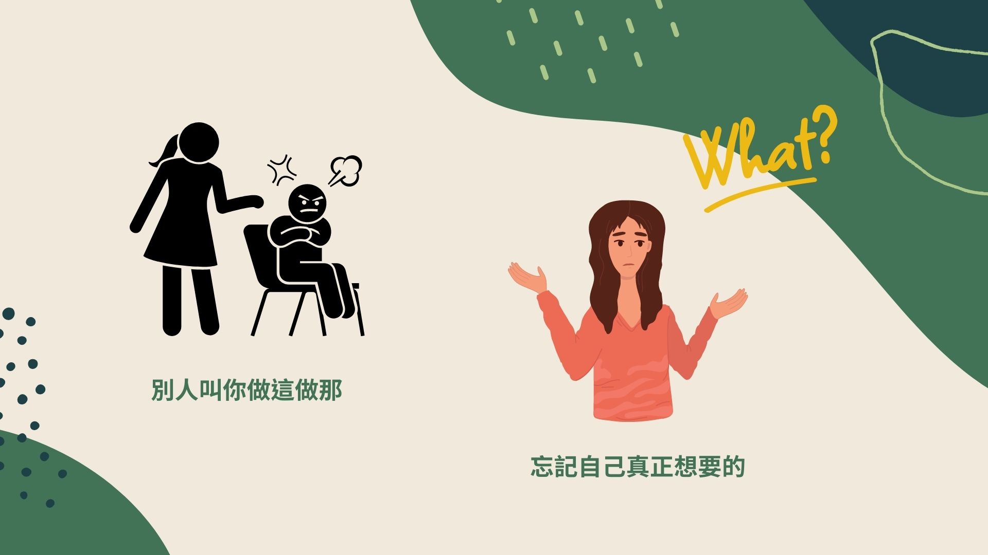 我相信每個人可能都有這樣的心情,甚至說你都會一直在做,別人說你要做什麼、你要做什麼,結果你會忘記說你自己真正想要的是什麼,你開始懷疑人生