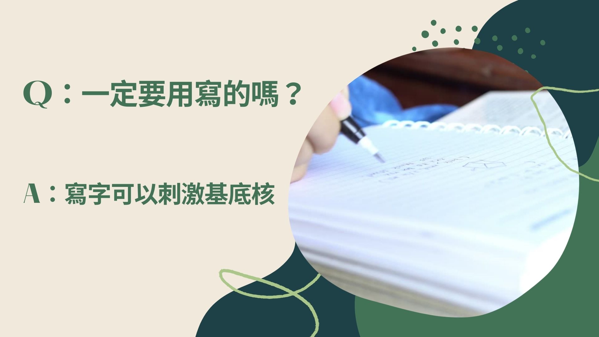 我覺得這個還蠻有一個學理存在的,因為他就跟你講說,你動手寫,寫字這個動作,就可以刺激你掌管情緒中樞有一個叫基底核這個物質