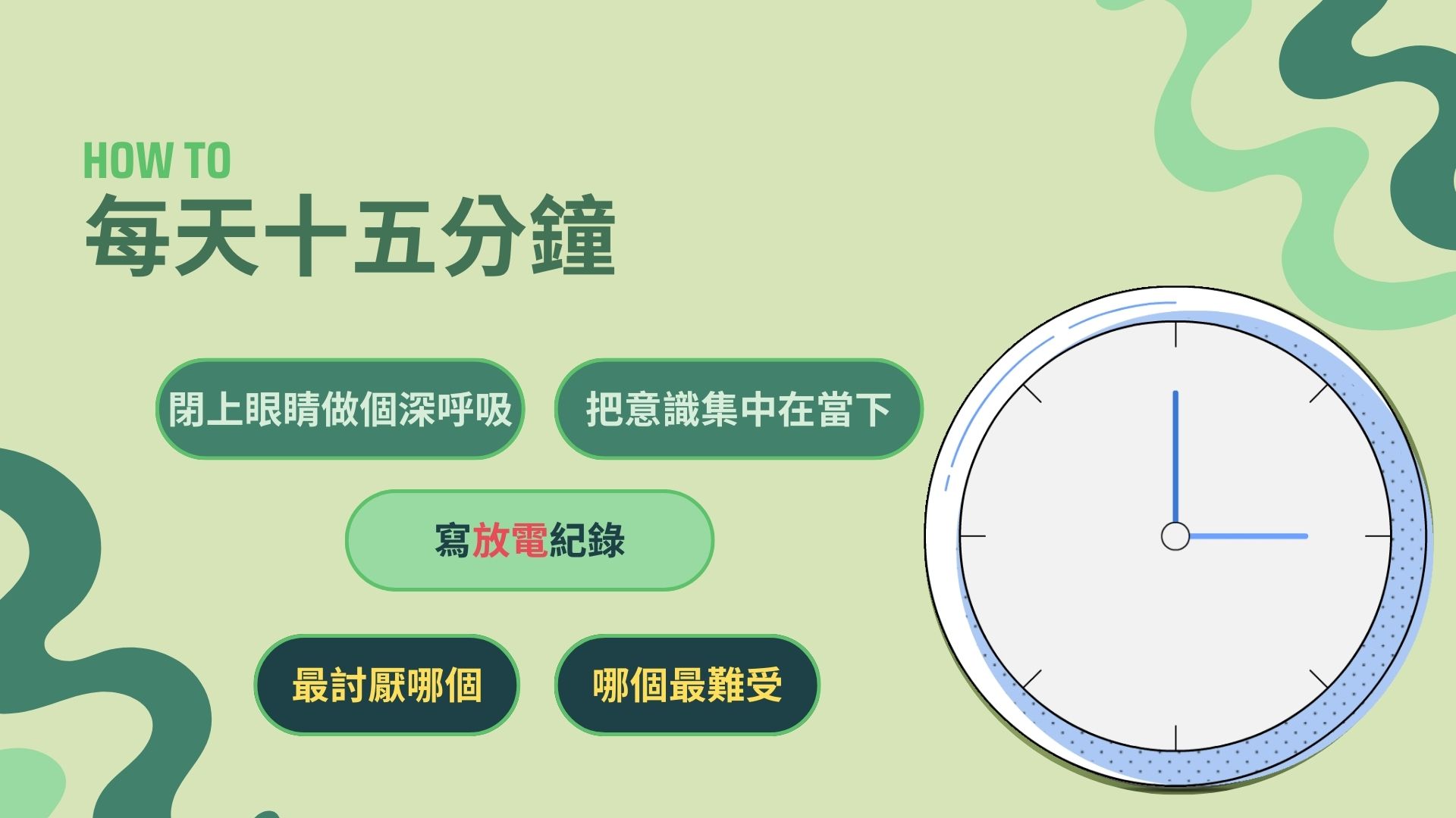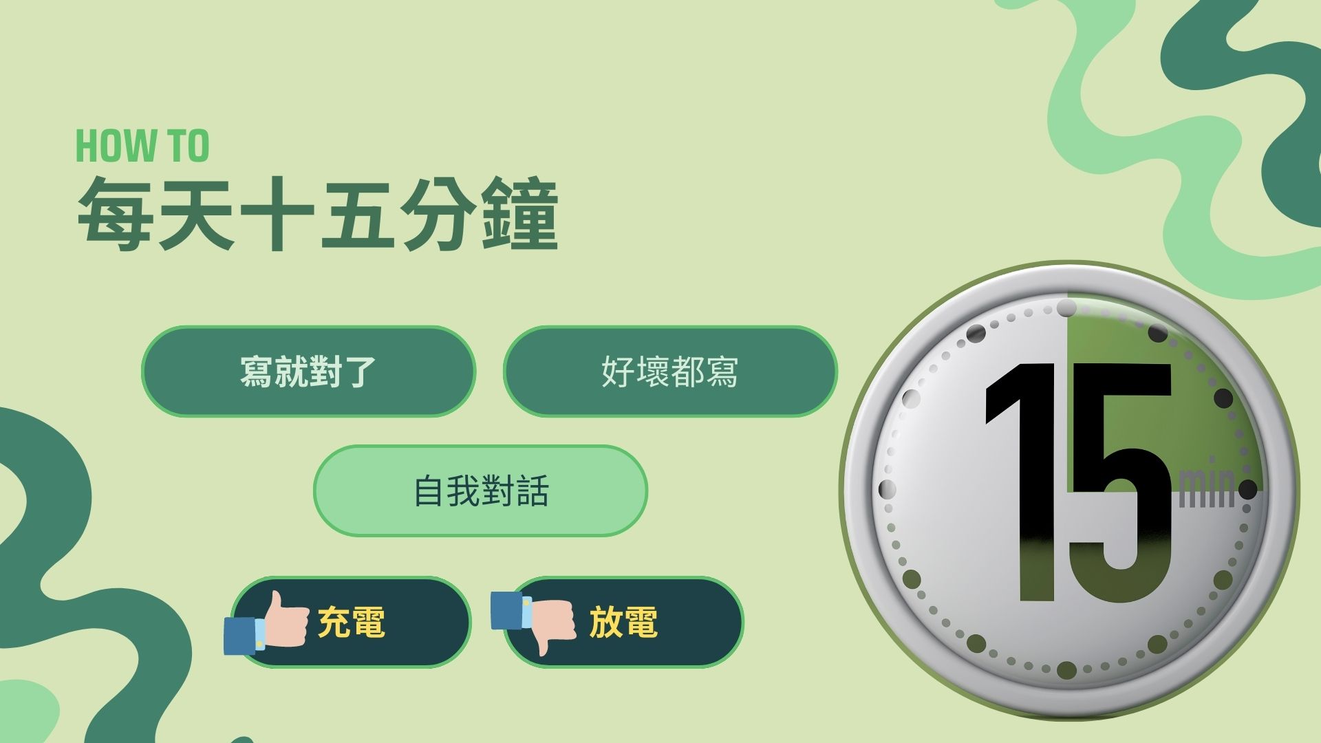 接下來一分鐘之後,我開始要來寫放電記錄,就是寫不好的事情寫3分鐘,然後放電完之後你開始要自我對話